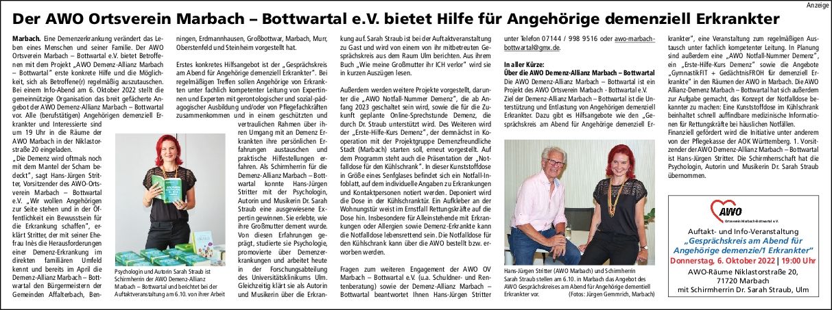 Die Auftakt und Informationsveranstaltung der AWO Demenz Allianz Marbach Bottwartal e.V. findet am 6. Oktober 2023 um 19 Uhr in den AWO Räumen in der Niklastorstraße 20, 71720 Marbach statt. "Gesprächskreis am Abend für Angehörige demenziel Erkrankter" Hier der Artikel aus der Marbacher Zeitung: